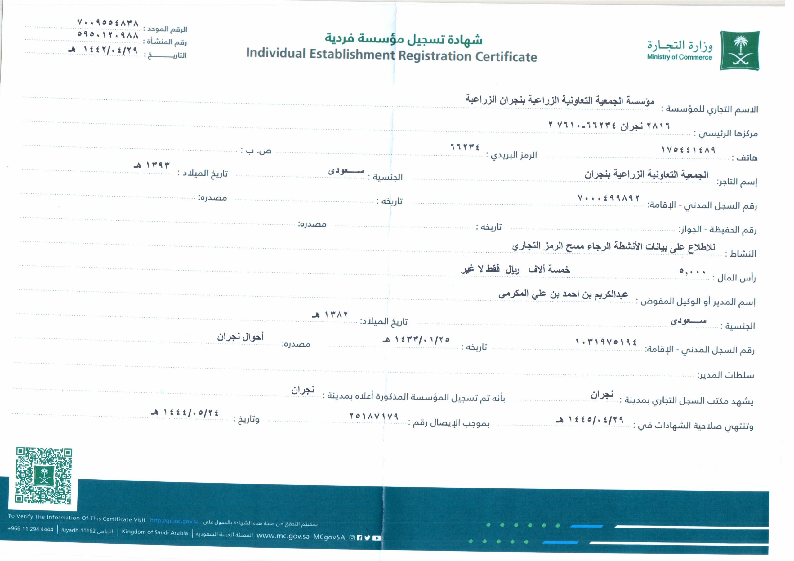 الرمز الالكتروني الموحد للجمعية التعاونية الزراعية بنجران
